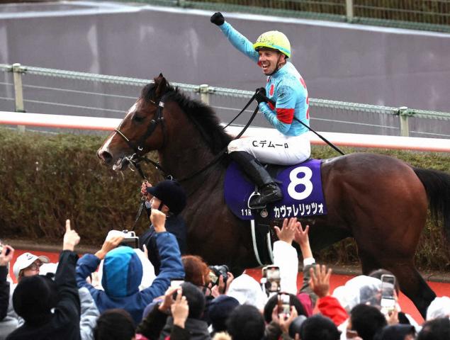 カヴァレリッツォの鞍上でファンの声援にガッツポーズで応えるC・デムーロ(撮影・長嶋 久樹)